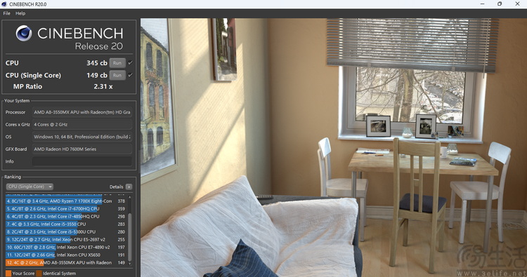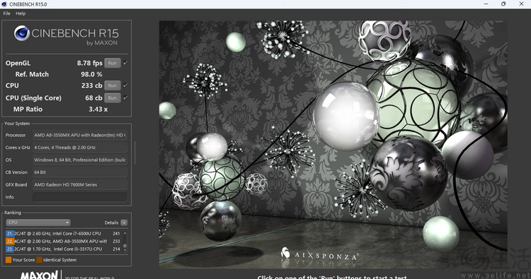 CINEBENCH R15里,A8-3550MX的多核性能介于3代和6代酷睿低压双核处理器之间,但它可要比这些处理器老得多。