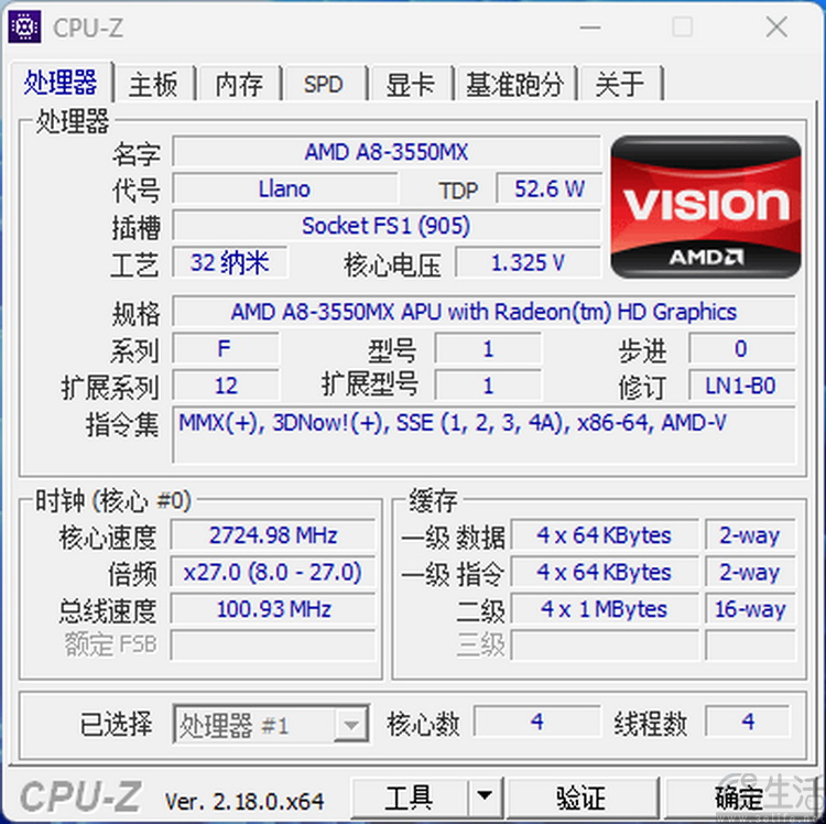 不外在2011年这个时候点,“推土机”还没出生,AMD的初代APU就只可使用更早的K10.5架构看成CPU部分。就拿咱们手头这颗A8-3550MX来说,它“反而”就因此领有了四颗无缺的、最高频率2.7GHz傍边的CPU中枢,以及四组各1MB的L2缓存。