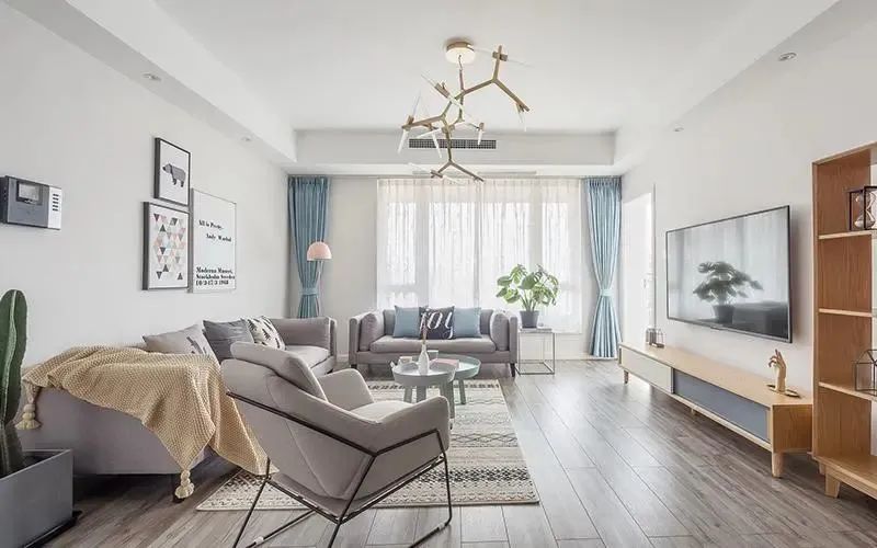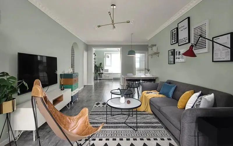 几何元素:用几何图案的抱枕、地毯、壁画作念软装,与绿植搭配,让客厅更有北欧小情调;