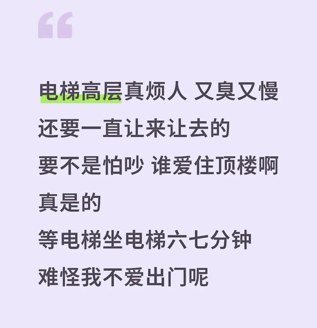 住顶楼,出行全看电梯心计!早岑岭晚岑岭等电梯,能等得东谈主心态爆炸,碰上停电或故障更是径直崩溃。