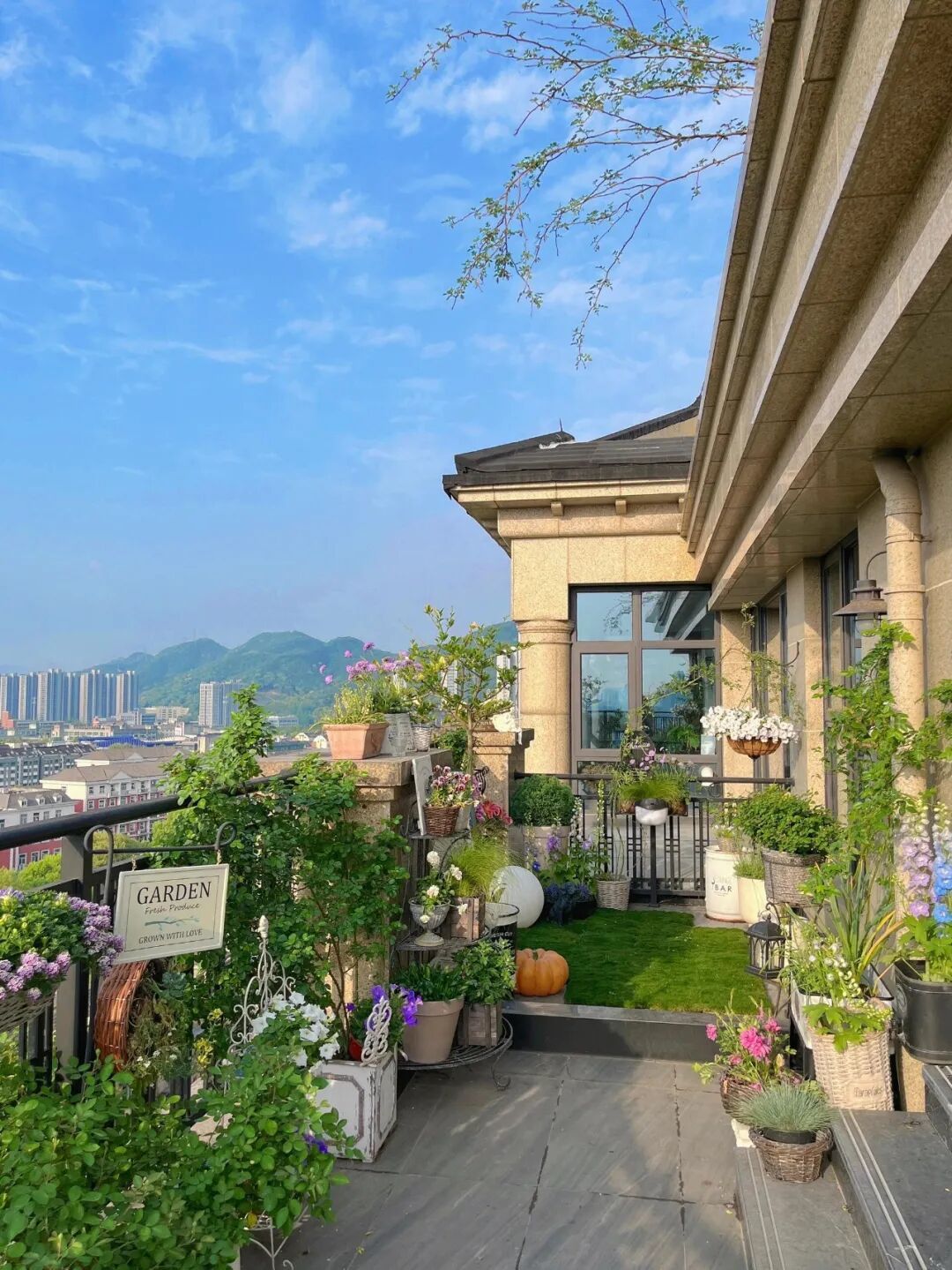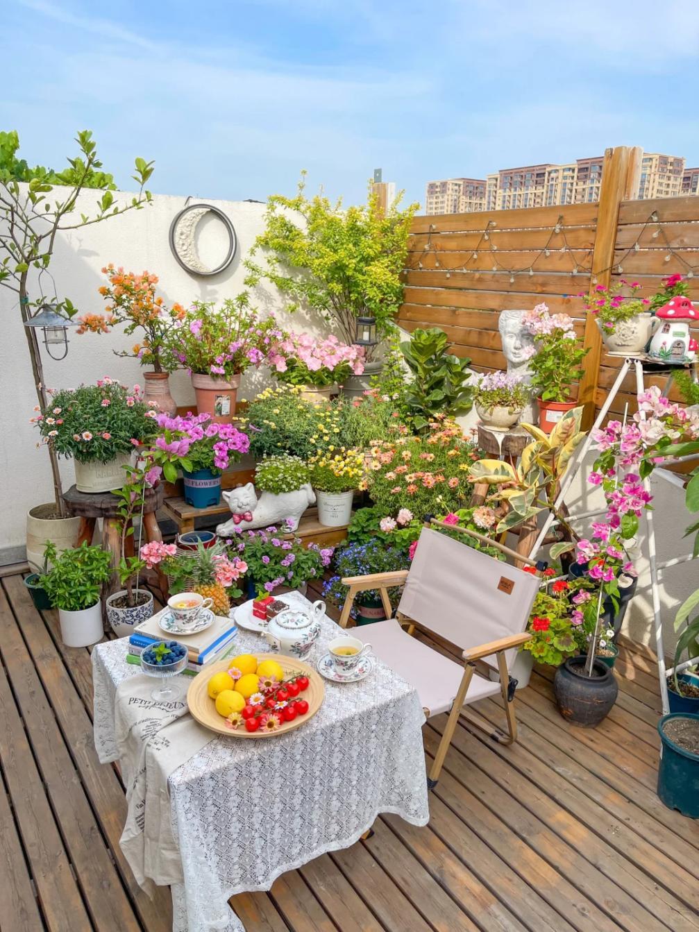我把露台改形成了空中花圃,种了月季、多肉,还有小番茄、生菜,春看花开、秋摘果,周末在露台喝茶赏花。