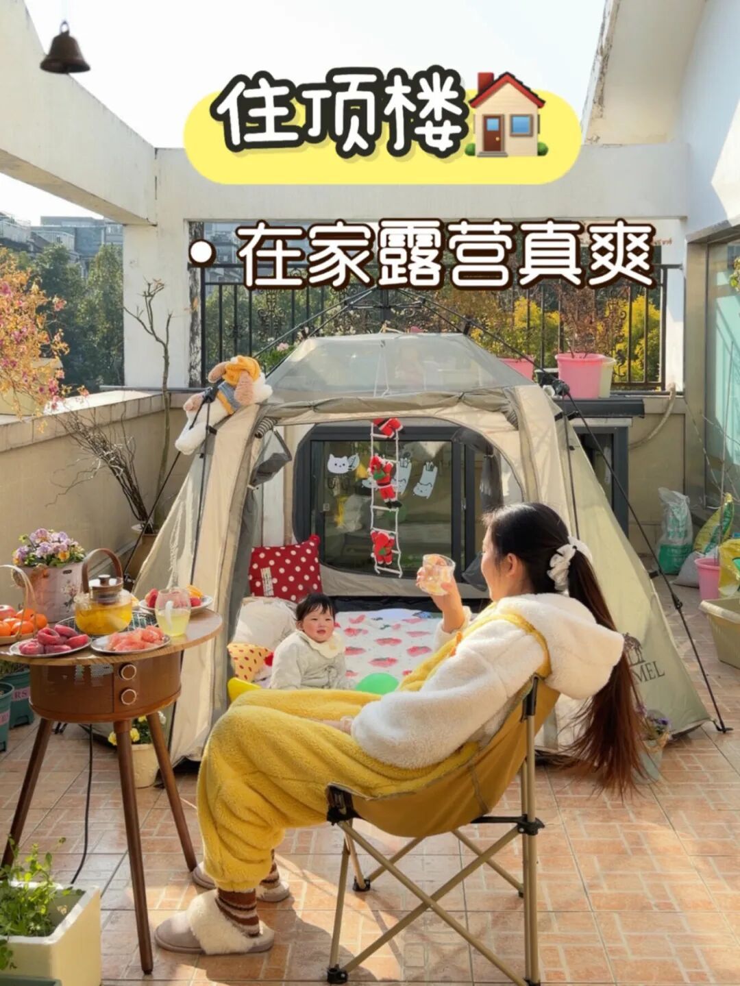 还不错摆上帐篷、小桌椅,晚上和一又友在露台烧烤、看电影,在家就能体验露营的逍遥。