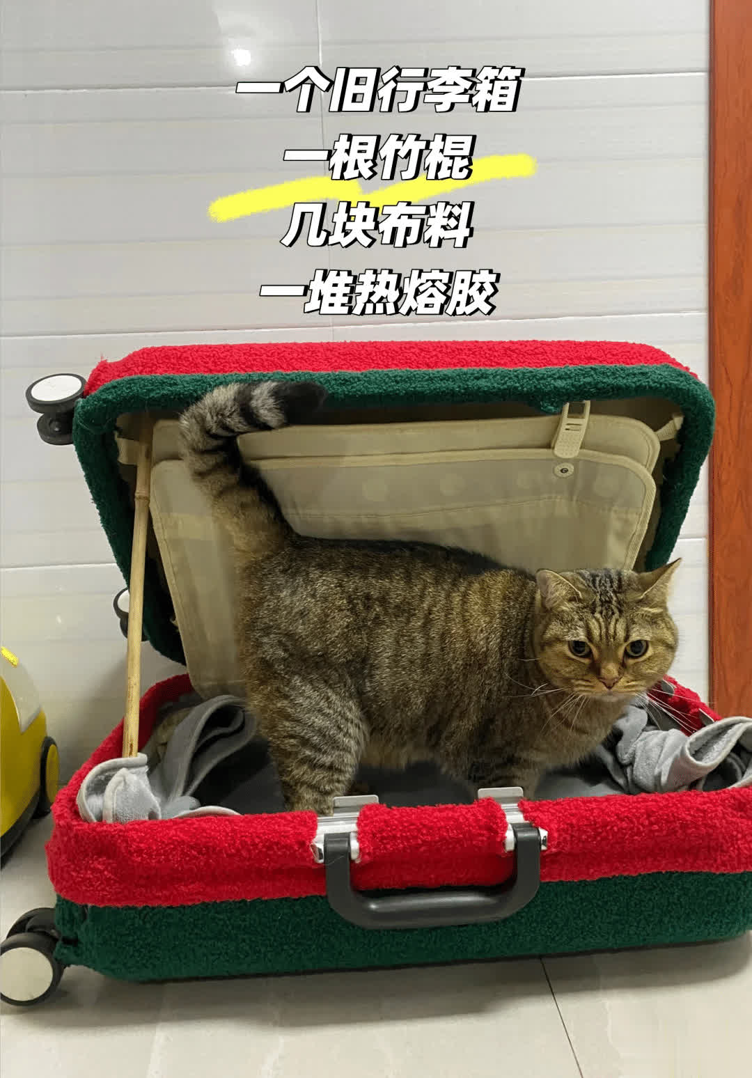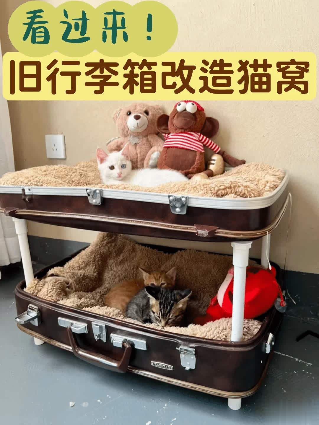 要是家内部有那种旧式或者还是坏掉的淘汰的行李箱,不错给蜕变成一个独处的猫窝,在网上径直购买桌子腿,然后将4根的桌子腿固定在行李箱的4个底边就不错了。在内部放上毛毯,就变成了一个温馨的猫窝。