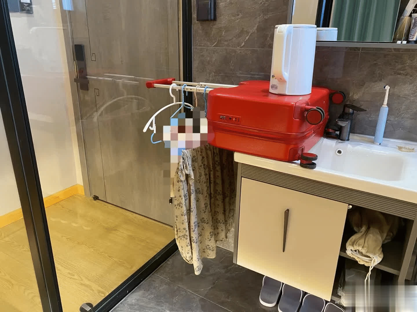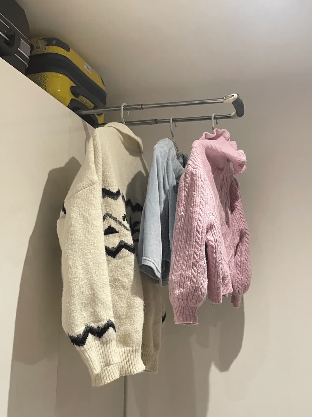 概念其实特殊纯粹,咱们只需要将柜子顶上头的行李箱拉杆拉出来,就变成了一个临时的晾衣架。
