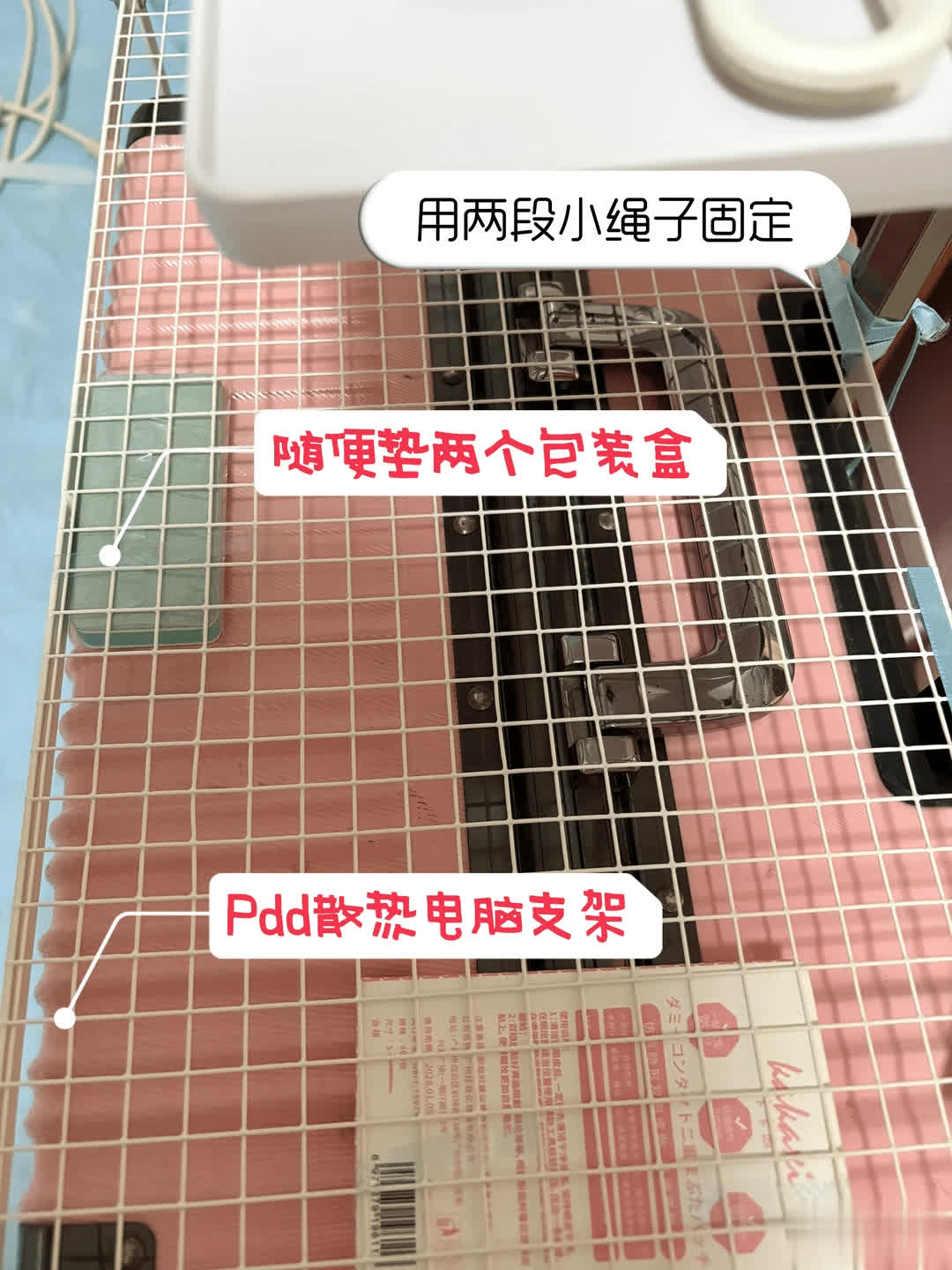 上头放着一个札记本散热支架,然后在拉杆的两头用绳索固定起来,要是招架整的话,不错三个位置垫高,用包装盒就不错。不错在拉杆上头安安设物托盘,惟有不放太重的东西,齐不错璷黫迁徙。