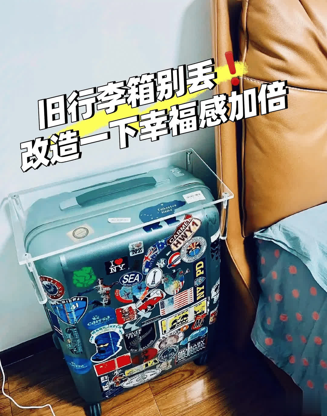 咱们只需要将行李箱放在床头柜的位置上,然后拉上一个帘子,根柢就看不出来,这居然是一个行李箱,还不错找一个亚克力板,固定在行李箱上来代替床头。平时放一些水杯,台灯等等,极少也不影响使用。