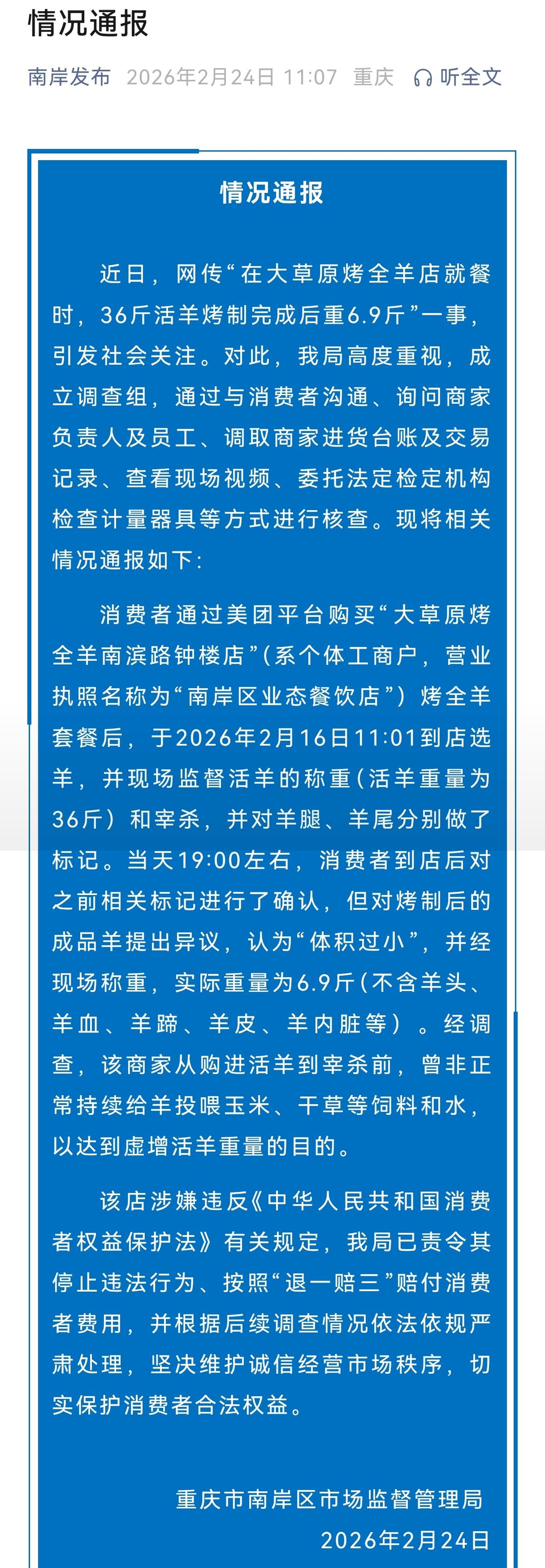 2月24日,重庆市南岸区市集监督措置局通过“南岸发布”,通报了网传“在大草原烤全羊店就餐时,36斤活羊烤制完成后重6.9斤”事件的关联探访情况。通报称,商家从购进活羊到屠宰前,曾非平常投喂以达到虚增活羊分量的指标。该店涉嫌违背臆测规定,市集监管部门已责令其住手坐法手脚、按照“退一赔三”赔付销耗者用度,并凭据后续探访情况照章依规严肃处理。