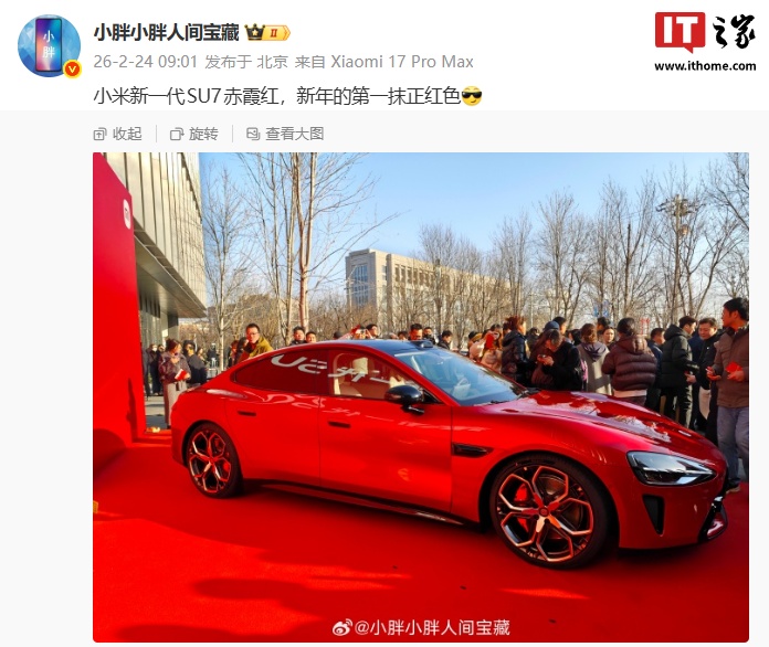 小米集团高等传播司理 @小胖小胖东说念主间矿藏 本日也共享图片,展示了新一代 SU7「赤霞红」的其他角度外不雅,声称“新年的第一抹正红色”。