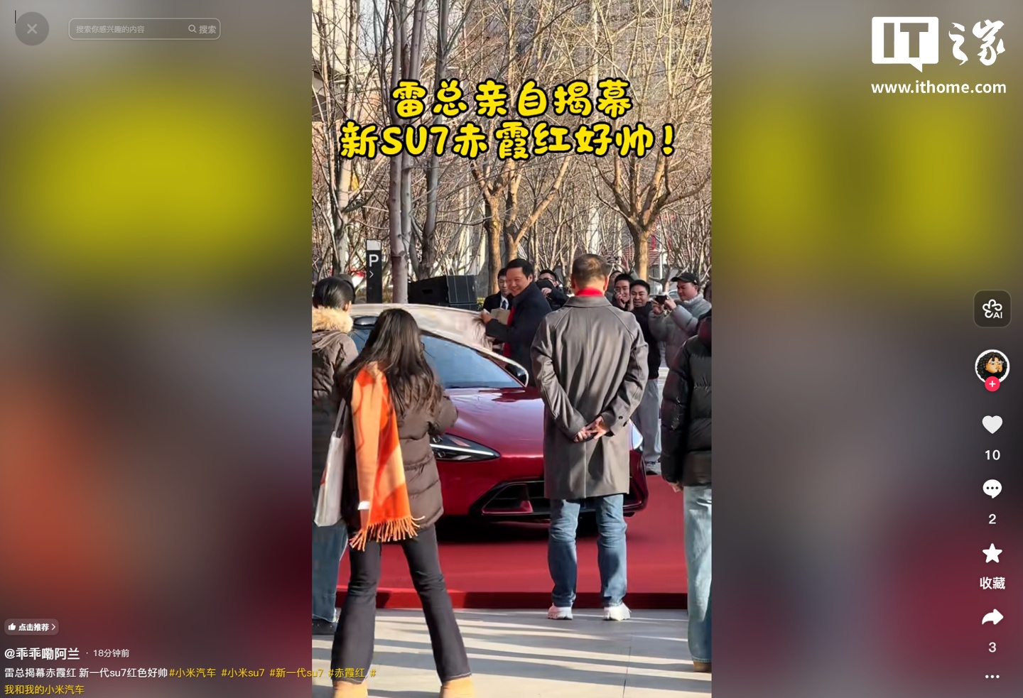 IT之家 2 月 24 日音信,博主 @乖乖嘞阿兰 本日共享,小米创办东说念主、董事长兼 CEO 雷军躬行揭幕了新一代 SU7「赤霞红」。受限于拍摄角度,新车外不雅未能一王人展现,但能看到「赤霞红」属于深红色系,视频里的不雅感访佛酒红色。