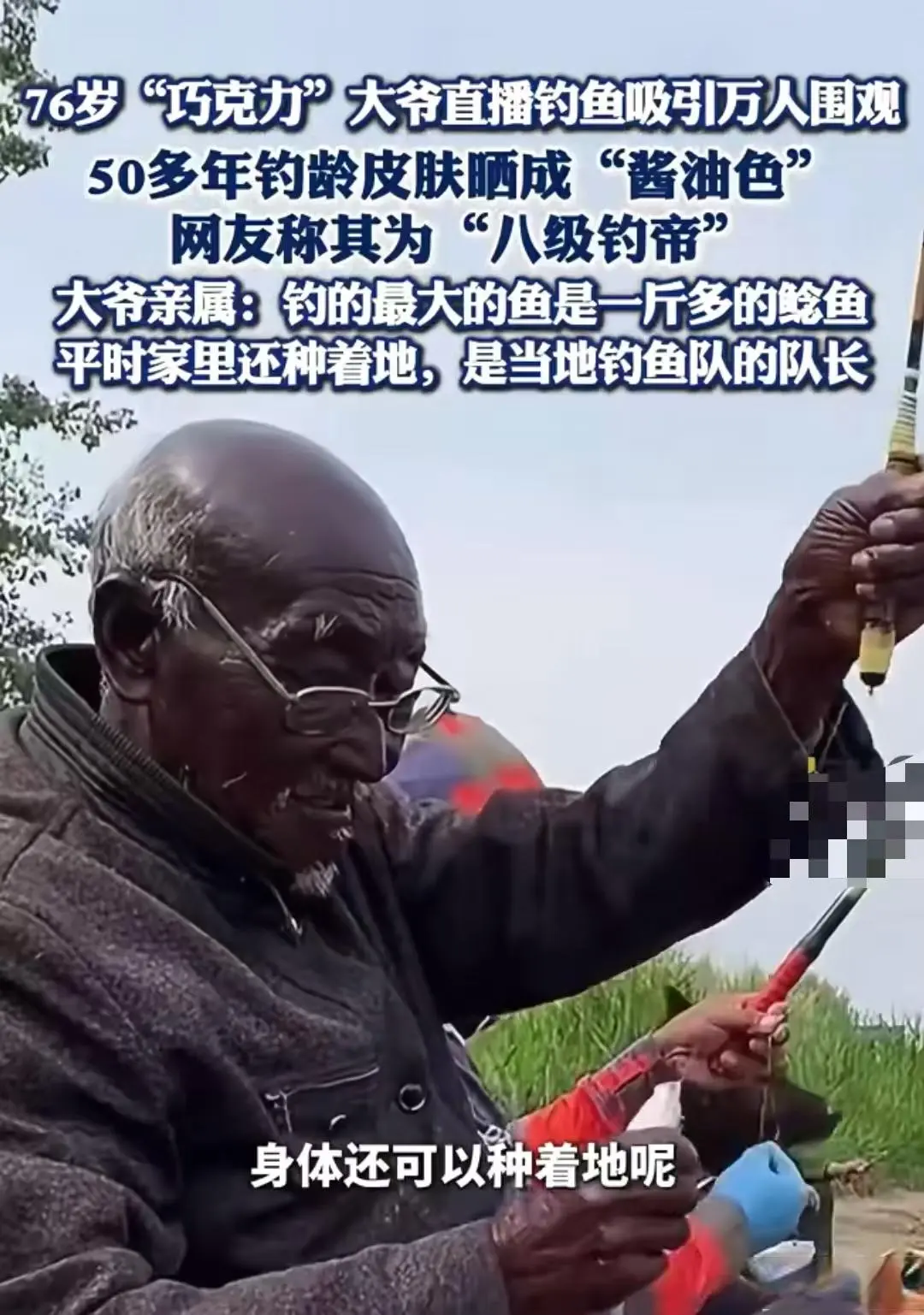 75岁的他,一辈子最爱垂钓,风吹日晒几十年,皮肤晒成了健康的深褐色,被网友笑称“巧克力色”。