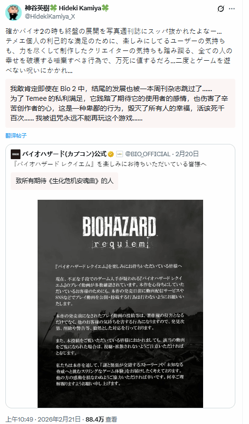 跟着《生化危险:安魂曲》(Resident Evil Requiem)发售独揽,网罗上开动疯传议论本作剧情及结局的泄密骨子。对此,曾执导原版《生化危险2》的传说制作主说念主神谷英树在叮嘱平台 X 上火力全开,痛斥泄密者的步履“死不及惜”。