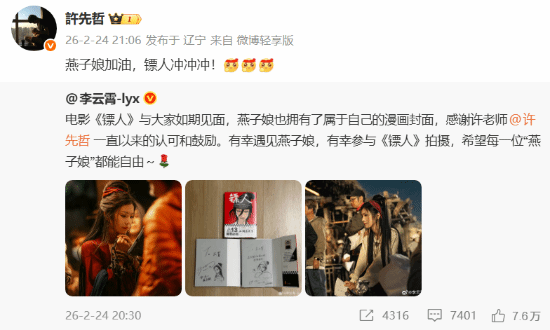 “电影《镖东说念主》与各人依期碰面,燕子娘也领有了属于我方的漫画封面,幸运5星彩app感谢许敦厚一直以来的认同和饱读吹。有幸碰见燕子娘,有幸参与《镖东说念主》拍摄,但愿每一位“燕子娘”齐能目田~”