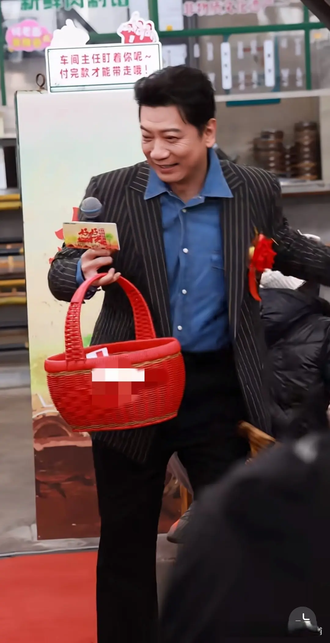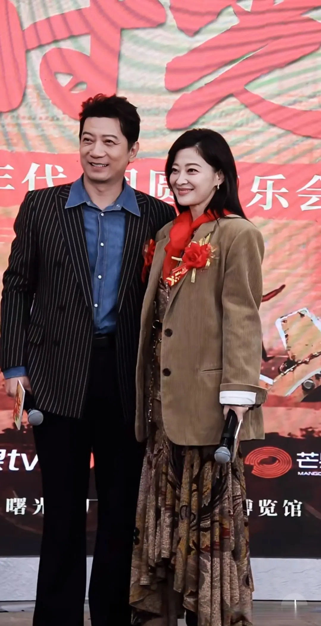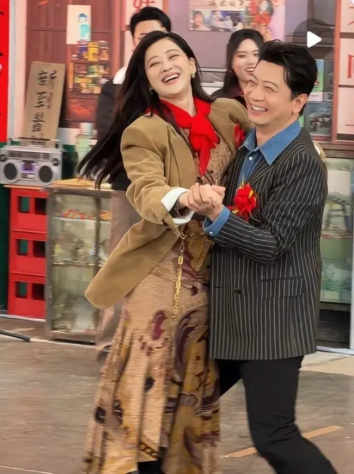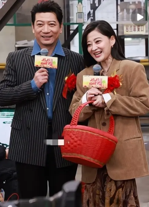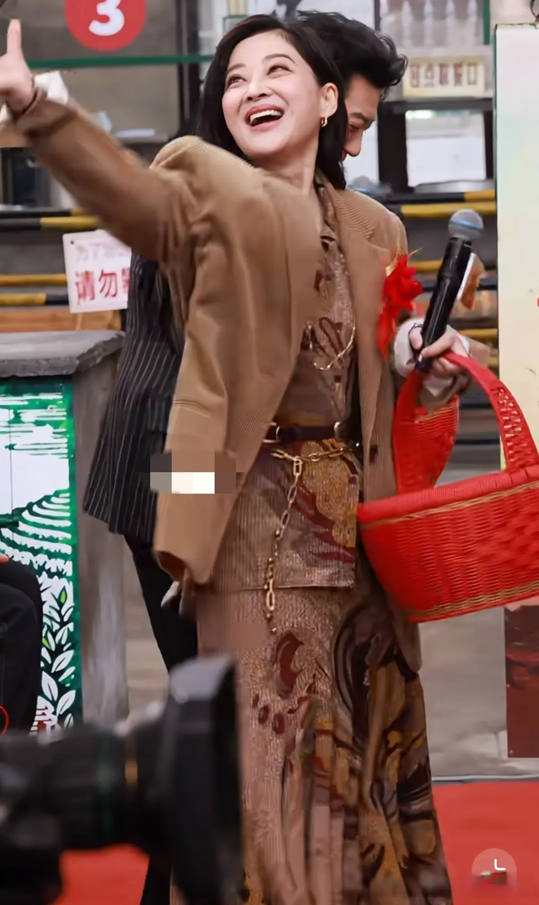 梅婷衣裳卡其色灯炷绒西装亮相,内搭维握斑纹长裙,别着红绸配金丝的大胸花,手提红藤编篮子,笑得眉眼弯弯;田雨孤单条纹西装,戴着同款胸花,手握发话器和手牌,两东说念主死后是绿铁架和老牌号,活脱脱80年代走亲戚送喜礼的细君模样。